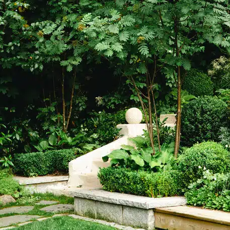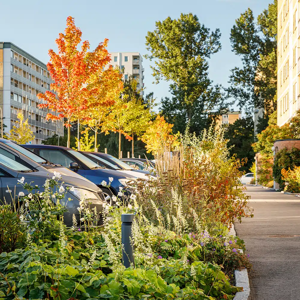 Stensö bostadsgårdar från slutet av 1960-talet har rustats upp i etapper. Gårdarnas växtgestaltning bygger på en enkel stomme av robusta och tåliga buskar och träd med inslag av vintergrönt material och fina höstaspekter. I kontrast till de enkla buskytorna finns artrika perennytor och inslag av mer lummiga woodlandplanteringar.