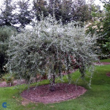 Utseende: Vita blommor på våren. 2-3cm breda hårda päron. Sliverglänsande elliptiska blad.